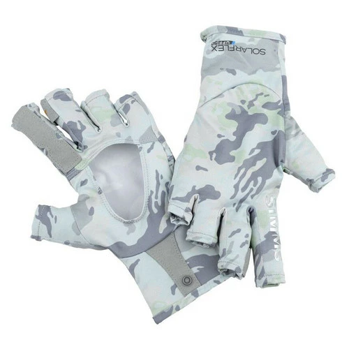Simms’ SolarFlex™ SunGloves shield hands from a blasting sun with UPF50 stretch fabric in a nimble half-finger design. Lightweight, grip ready gloves feature extended coverage on index and middle fingers for stripping durability, while extended cuffs shutter wrists and come equipped with pairing snaps for easy storage. Now available in Fractal Camo colorway. Features Lightweight, UPF50 sun glove with improved coverage & fit Synthetic overlay on the index finger for stripping durability Half finger style with extended coverage on index/middle fingers, long length to cover the wrists & pairing snaps for storage FABRIC TECH: Solarflex™ UPF50 stretch fabric APPROX. WEIGHT: 10 oz